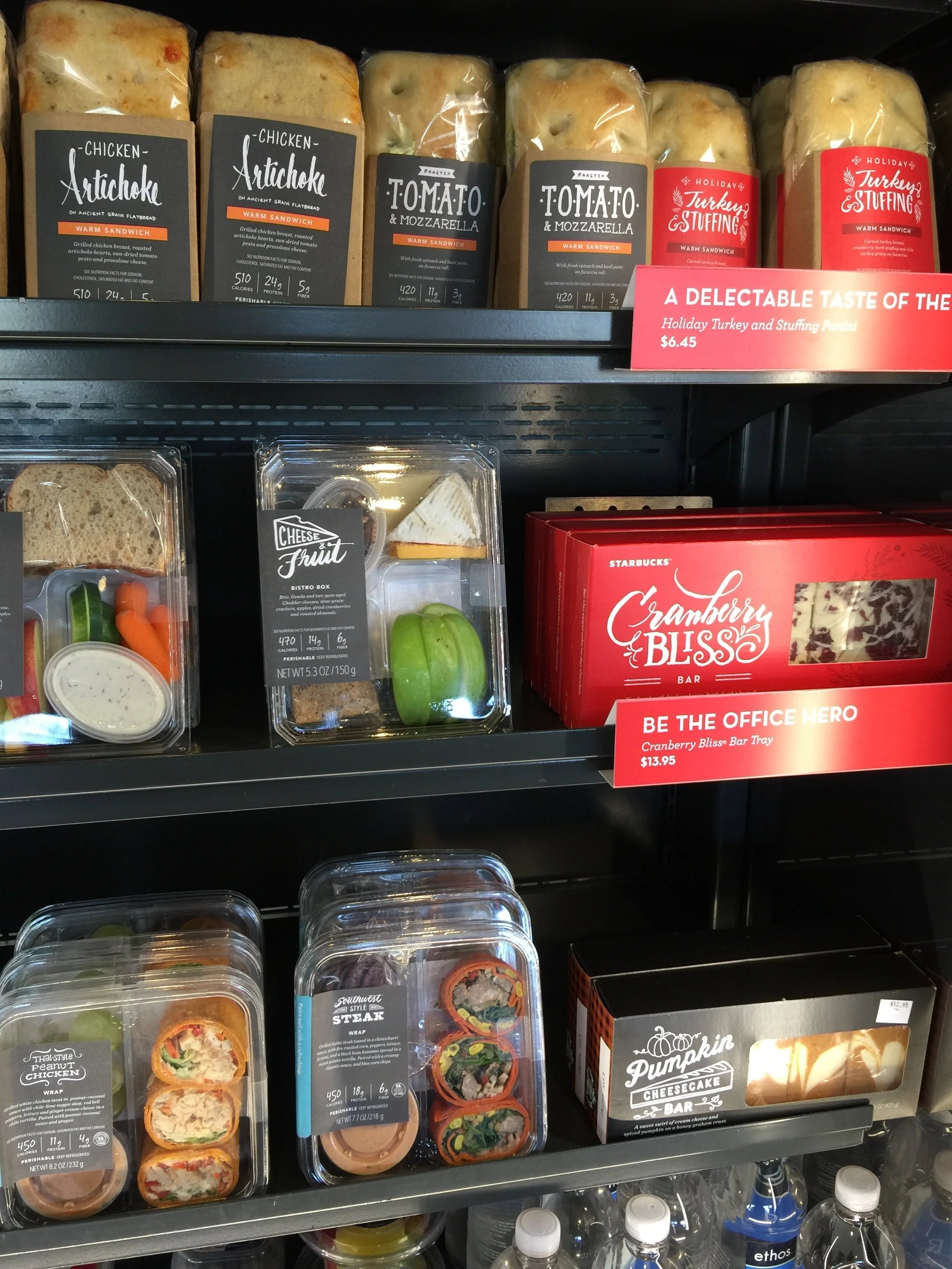 A variety of food label designs utilizing hand-drawn typography for Starbucks fresh food case labels: Items included: hot and cold sandwiches, bistro boxes, fruit cups, string cheese, avocado spread, and sriracha sauce packets.